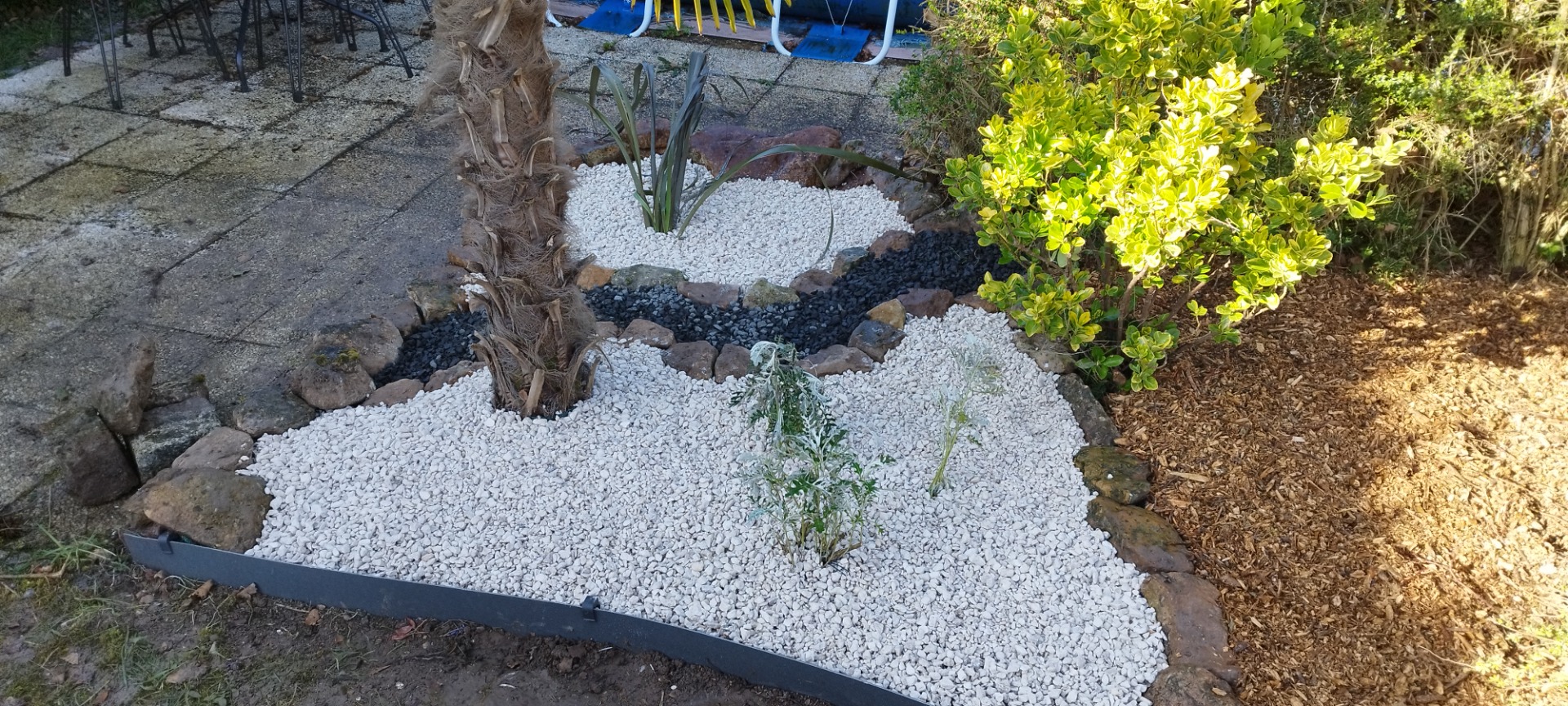 Effet rivière en gravier, plantations, pose de bordure souple en rouleau