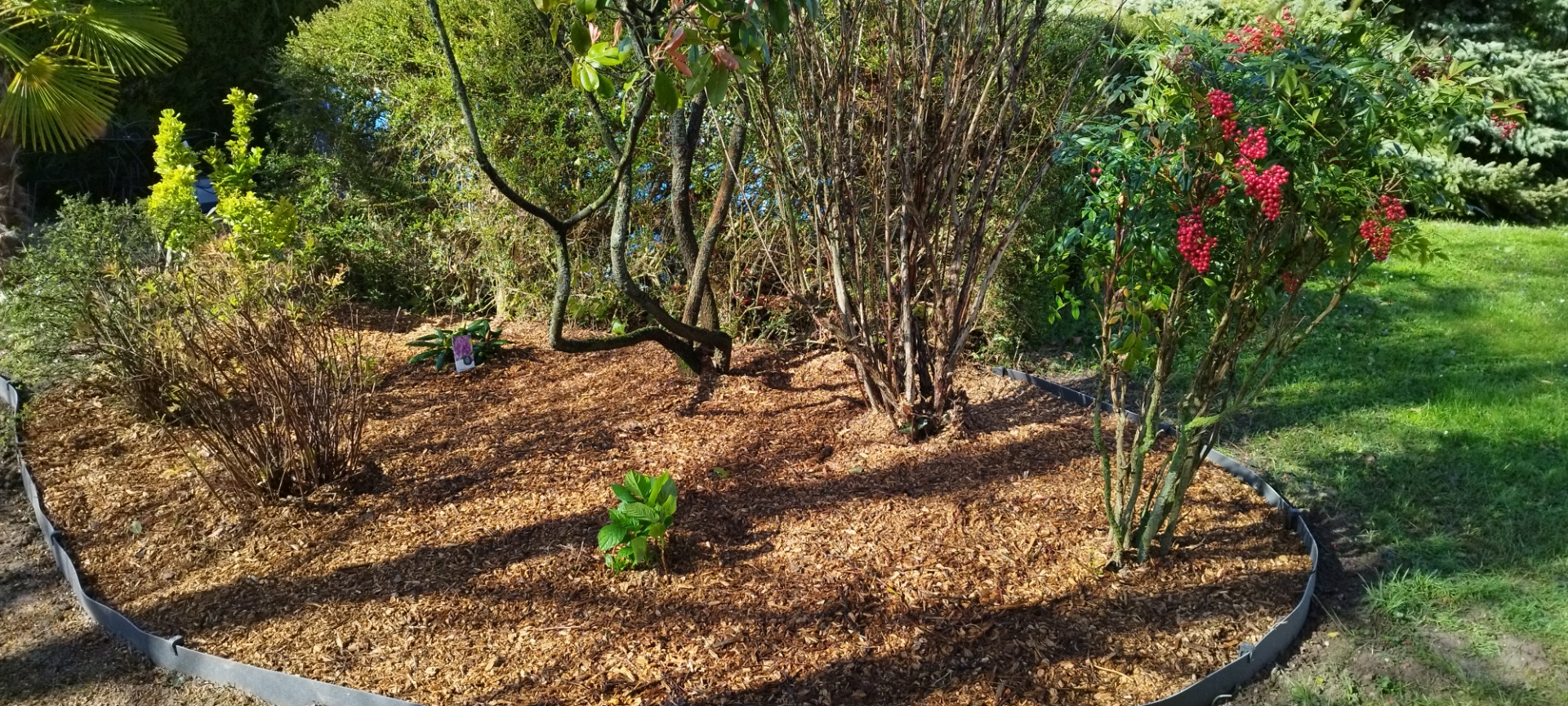 Plantations, pose de bordure souple en rouleau, paillage en BRF